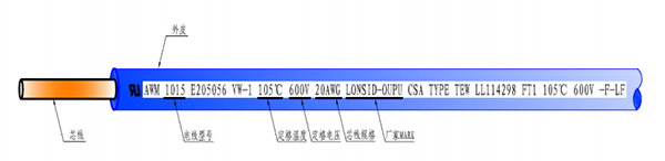 以UL1007 22AWG為例子,上面的印字內(nèi)容為:AWM 1007 22AWG 80°C 300V VW-1 E503941 FP AWM I A 80°C 300V FT1。我們首先要拆分印字上的內(nèi)容,單獨(dú)去解讀每一個(gè)印字所表達(dá)的意思。