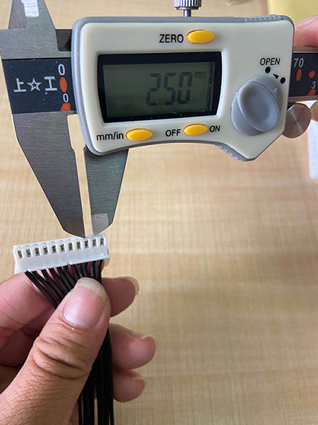 首先,面對一般常用的端子線,例如1.0mm,2.0mm,2.54mm的端子線,怎么去判斷呢?判斷之前,我們需要明白這個數(shù)值所代表的意義,其實1.0mm,2.0mm,2.54mm,指的就是端子線相鄰針腳之間的距離,我們拿到一條端子線,最簡單判斷端子線具體規(guī)格型號的方法就是,先去測量端子線相鄰針腳之間的距離,根據(jù)端子線相鄰針腳之間的距離,我們就可以大概得知這個端子線所用的端子型號,如下圖所示,測量得出端子線相鄰針腳之間的距離為2.5mm,則端子線的型號為2.5間距端子線。
