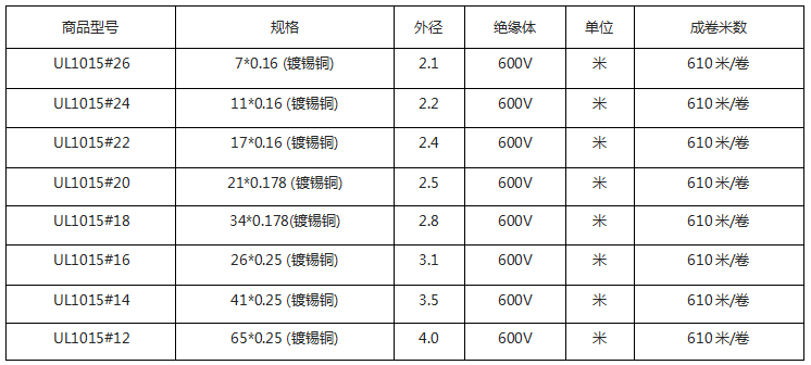 | 產(chǎn)品名稱:UL 1015 用于電子、電器設(shè)備內(nèi)部連接 一.技術(shù)參數(shù) 技術(shù)標(biāo)準:UL758、UL1581,及CSA、SGS相關(guān)技術(shù)標(biāo)準 額定電壓:600V 額定溫度:﹣60℃-﹢105℃ 導(dǎo)體類型:鍍錫銅絲 絕緣材料:PVC 產(chǎn)品顏色:紅/藍/黑/白/綠/黃等等 二.產(chǎn)品用途 廣泛應(yīng)用于航空、冶金石油、電子電氣、儀器儀表、家用電器、燈飾照明、變壓器以及電機引出線、汽車電線。 三.詳細規(guī)格 ![]() 我司擁有先進的電子線壓出機,并已經(jīng)取得相關(guān)的UL認證、環(huán)保認證,不同規(guī)格的線材,皆可按需定做,歡迎各位客戶來圖定制、來樣做貨,我司提供免費打樣。 |